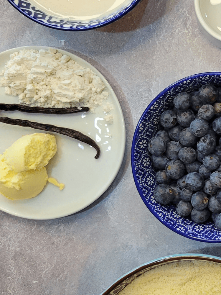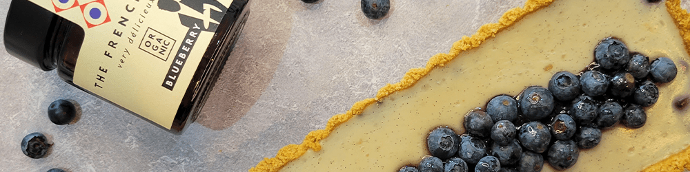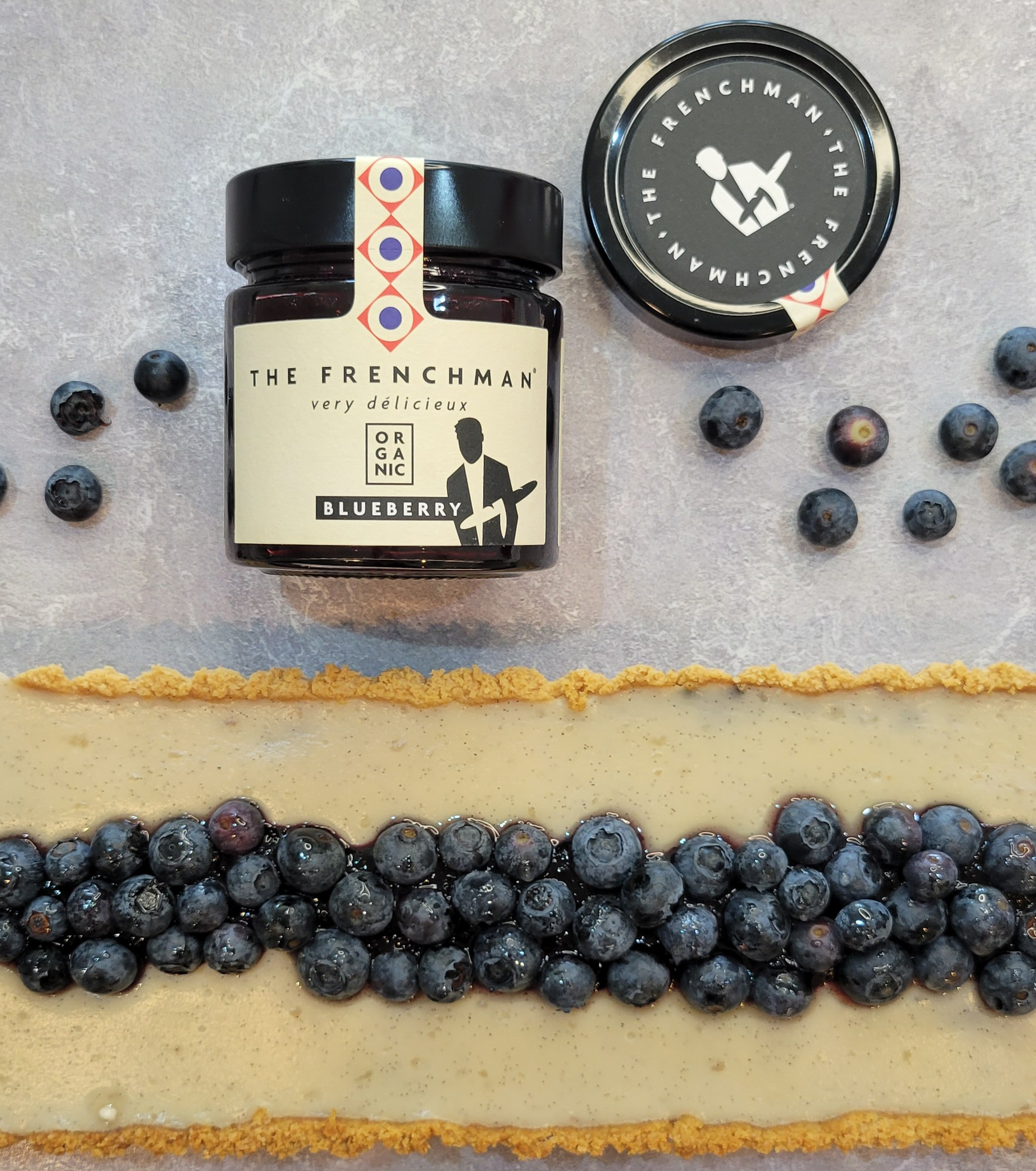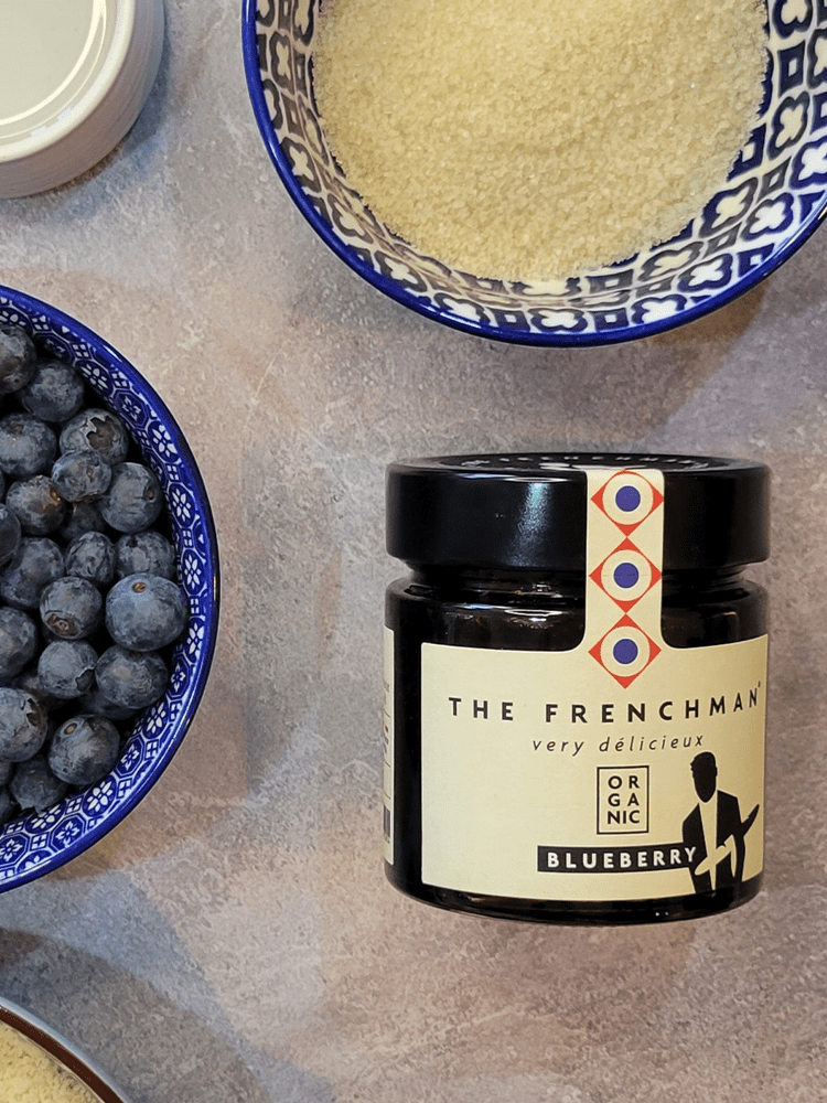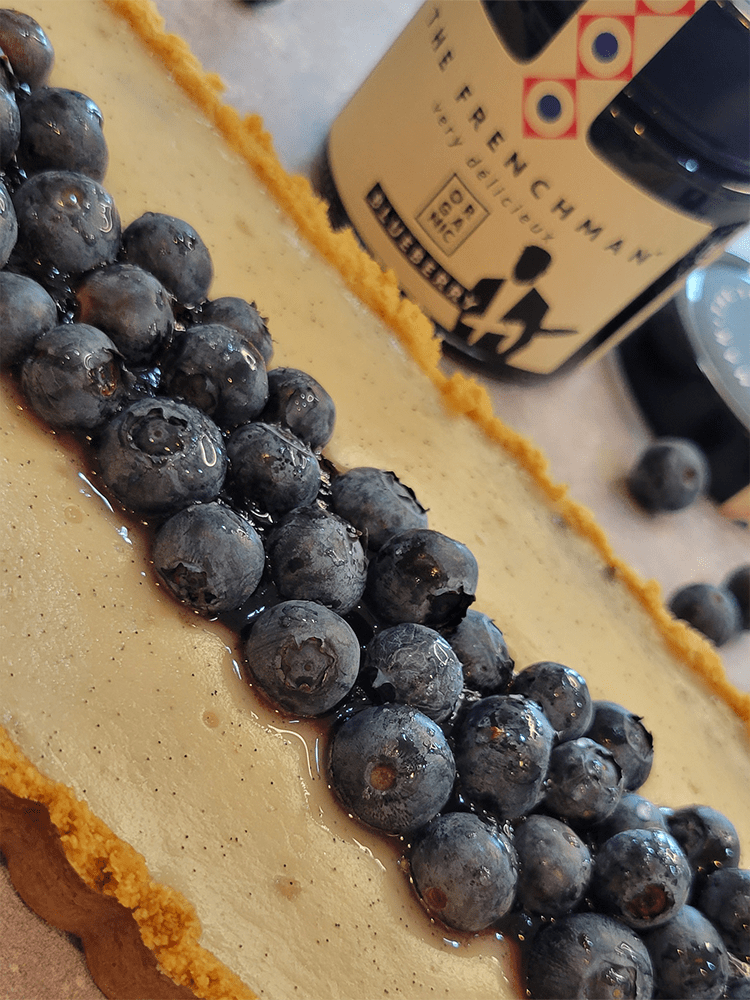 13. Decorate as you want, we like to add a line of Blueberry spread and arrange a cup of organic blueberries around it! Let your creativity speak! Let is rest of 3 hours.
