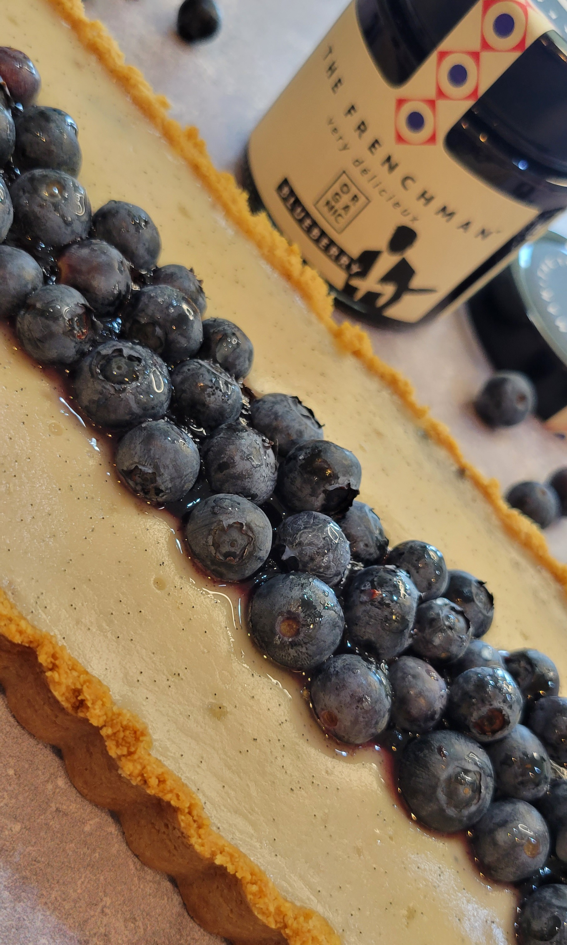 10. When both the cust and the custard are at room temperature, spread evenly the blueberry jam from The Frenchman on top of the crust.