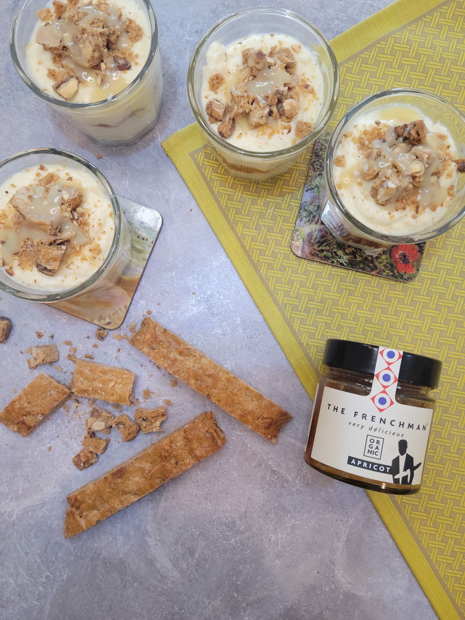 - Create an in-between layer using biscotti crumbs and two tablespoons of organic apricot spread.
