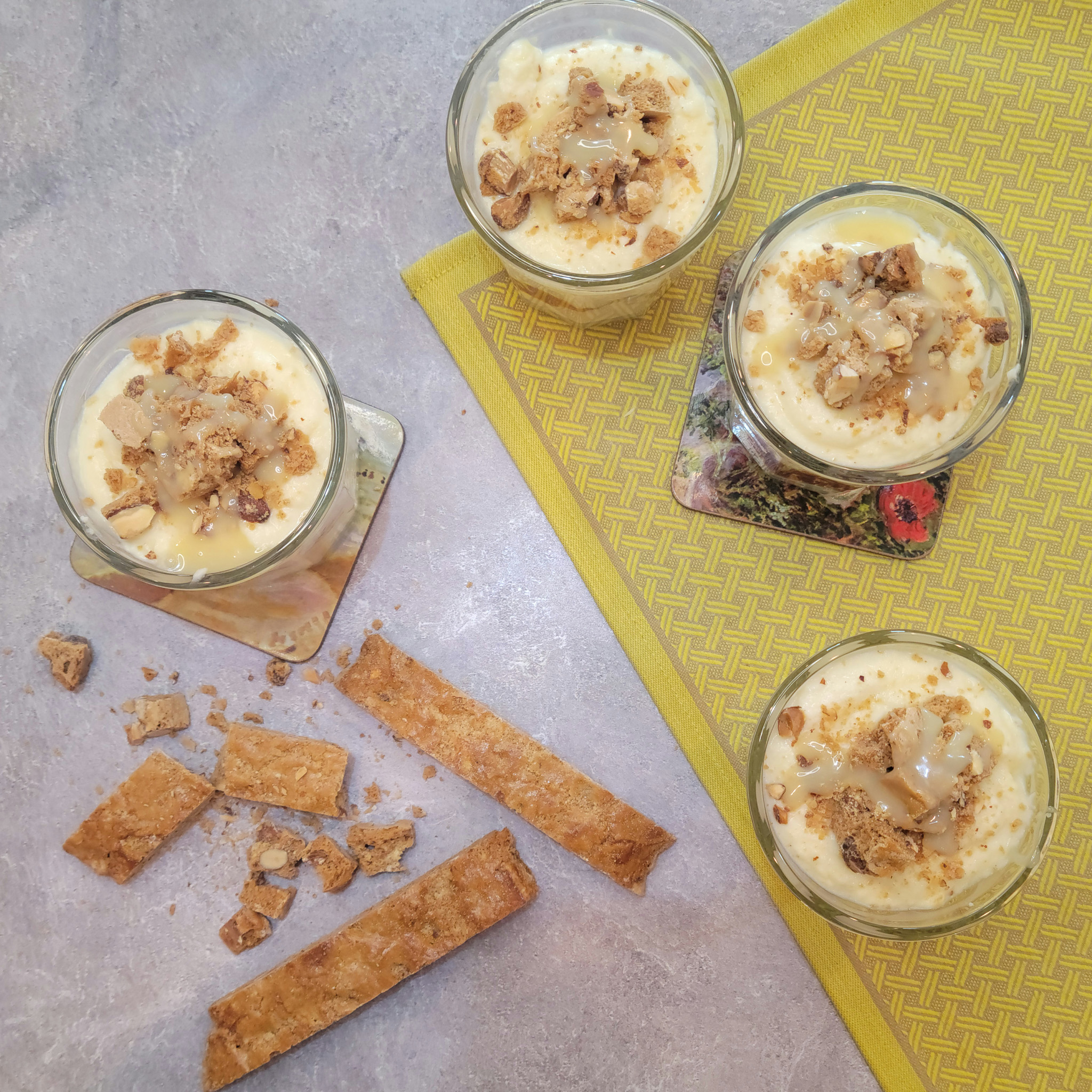 - Add another ladle of cream, and on the top layer, sprinkle the remaining biscotti crumbles and melted white chocolate.