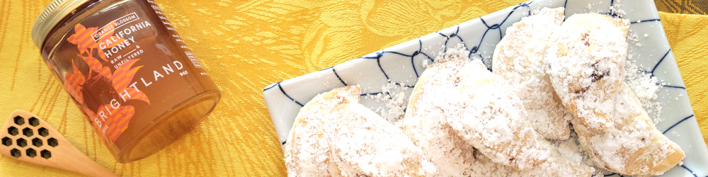 - After removing the pastries from the oven, drizzle Brightland’s Orange Blossom Honey over the top of each cookie and gently roll them in powdered sugar.