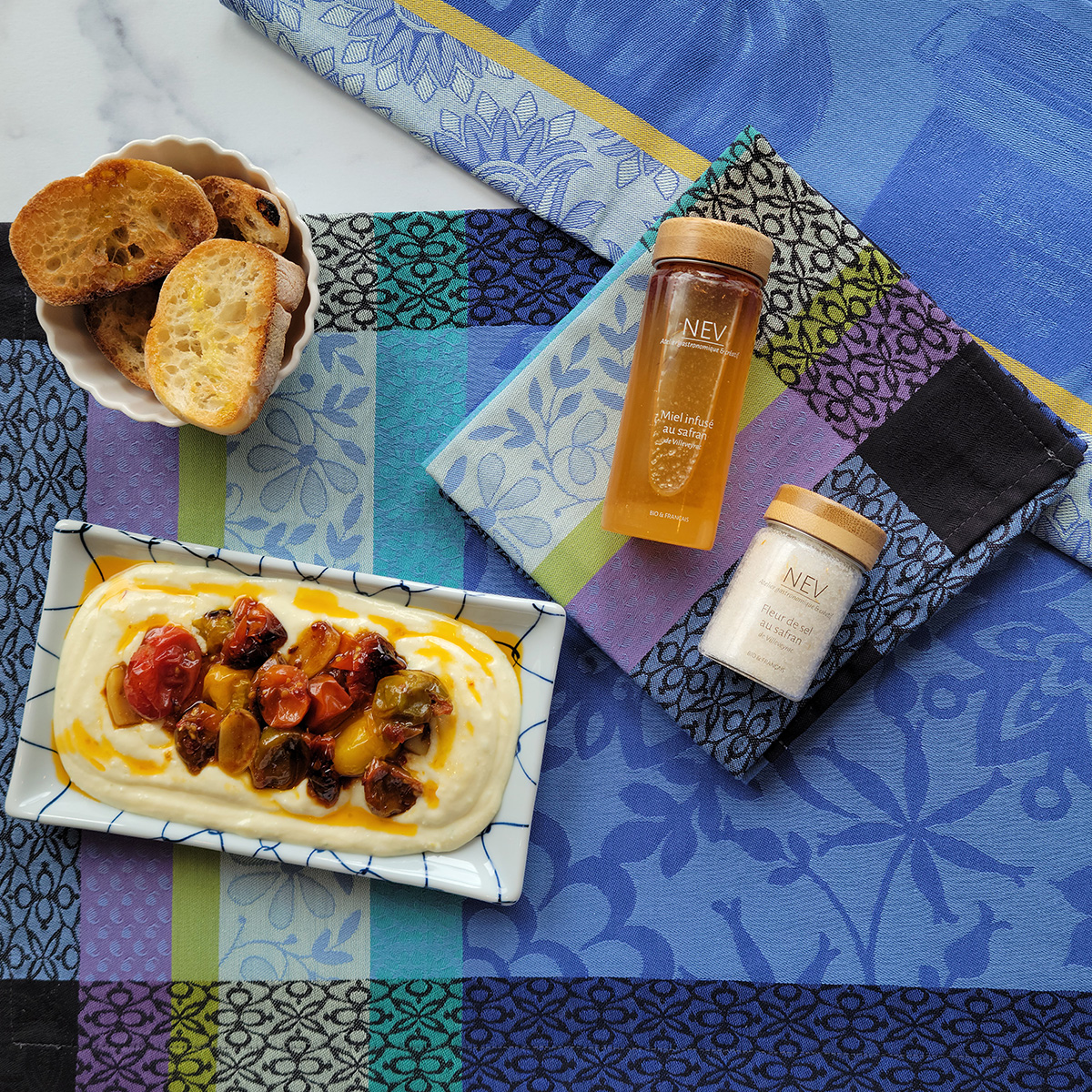 Saffron-Honey Ricotta Spread with Cherry Tomato Confit Delight