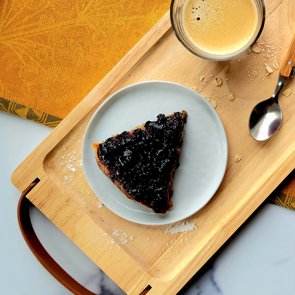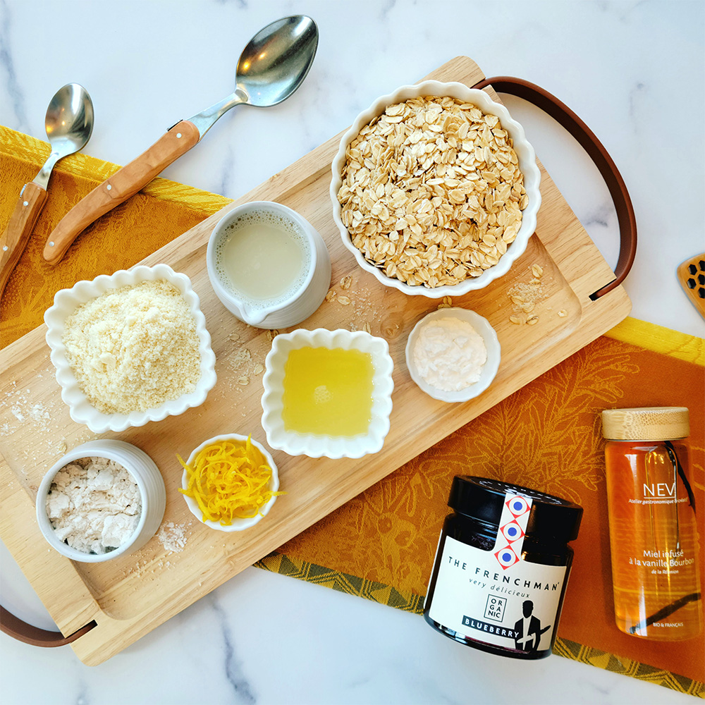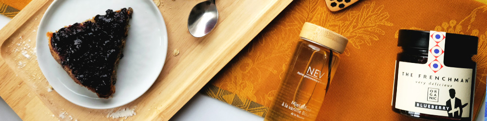 So, we set out to perfect it, fine-tuning it until it became our go-to baking recipe for those empty fridge moments. What makes it even better is that this recipe doesn’t require eggs or butter. You can substitute almond flour with any flour you have on hand, or skip it altogether. Lemon juice can be swapped for water, and for the jam, raid your pantry for any forgotten jar – in our case, it was the exquisite Organic Blueberry Jam from The Frenchman, but any jam will do. The Honey infused with Vanilla can be switched out for sugar, or if you’re out of sugar, reach for maple syrup.