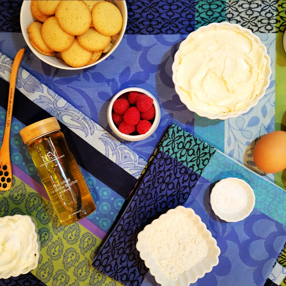 - Decorate your cake before serving with your favorite toppings, for us it was raspberries with a drizzle of Organic Honey infused with Vanilla from Nev!
